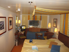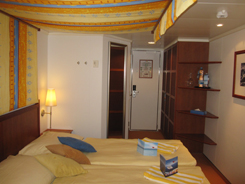 Lage: Deck 5 mitte/hinten, backbord Größe: 17,5 m² Doppelbett, 1 Couchbett Beschreibung: