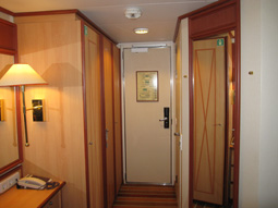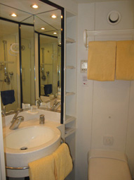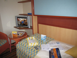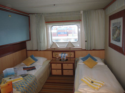 Lage: Deck 6 mittschiffs, backbord Größe: 13 m², 2 Einzelbetten, 1 oberes Klappbett Beschreibung: